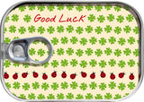 The package includes a sardine can gift card holder, a note card card and a sticker to close the open slot.